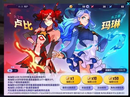玩家可在活动界面或商城购买“英雄币”使用可以抽取商品。抽取道具时会获得“英雄徽章”用于兑换道具以及新角色卢比&玛琳。道具抽取有概率获得新角色:卢比&玛琳、五星精锐队伍徽记卡等珍稀道具。卢比&玛琳各拥有一套永久专用能力套装。卢比&玛琳的边框为角色名边框。适用账号下所有角色。