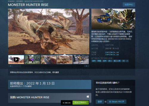 卡普空的动作狩猎游戏《怪物猎人:崛起》在今年3月登陆了任天堂Switch平台。今天的TGS 2021上官方公布了该作的新信息。这款游戏将于2022年1月13日正式登陆Steam平台,并支持大量PC性能提升。本作Steam页面已经正式上线,Steam页面显示本作预售价396元;本作具有完全手柄控制、支持繁简中文。