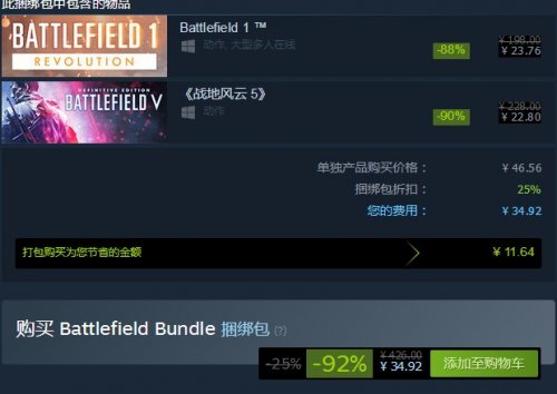 EA旗下的射击大作《战地1》和《战地5》在Steam平台开启了史低促销。此外还这两款游戏的捆绑包,价格超级实惠打0.8折。《战地1》+《战地5》的捆绑包原价426元,-92%后优惠价格为34.92元。感兴趣的玩家赶紧买买买吧。