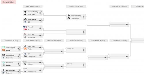 首日共有两场胜者组比赛和四场败者组决赛,中国战队iG让1追2战胜了B组第四的Team Spirit。之后的欧洲内战中,Team Secret以2-0干净利落地将OG送入了败者组。