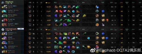 前期双方平稳过渡,中期EG的暗夜魔王和露娜利用夜晚频繁扫图,视野越做越深,小象逐渐没法出门。肉山盾团小象虽然抢盾成功,但风暴之灵买活阵亡,EG成功攻破小象两路。整顿后EG破三路淘汰了Elephant。