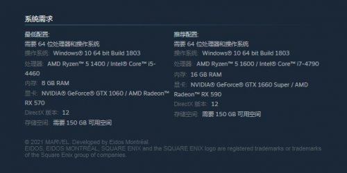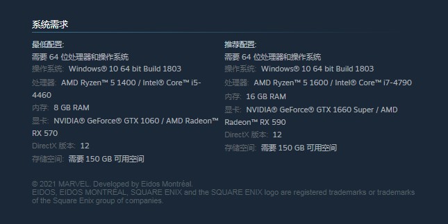 Square Enix旗下的《漫威银河护卫队》将于10月26日发售,登陆PC、PS5、PS4、XSX、XboxOne平台。目前官方在Steam商店页面公布了该作的PC配置需求。游戏最低需要GTX 1060显卡+i5-4460处理器以及150GB的存储空间。