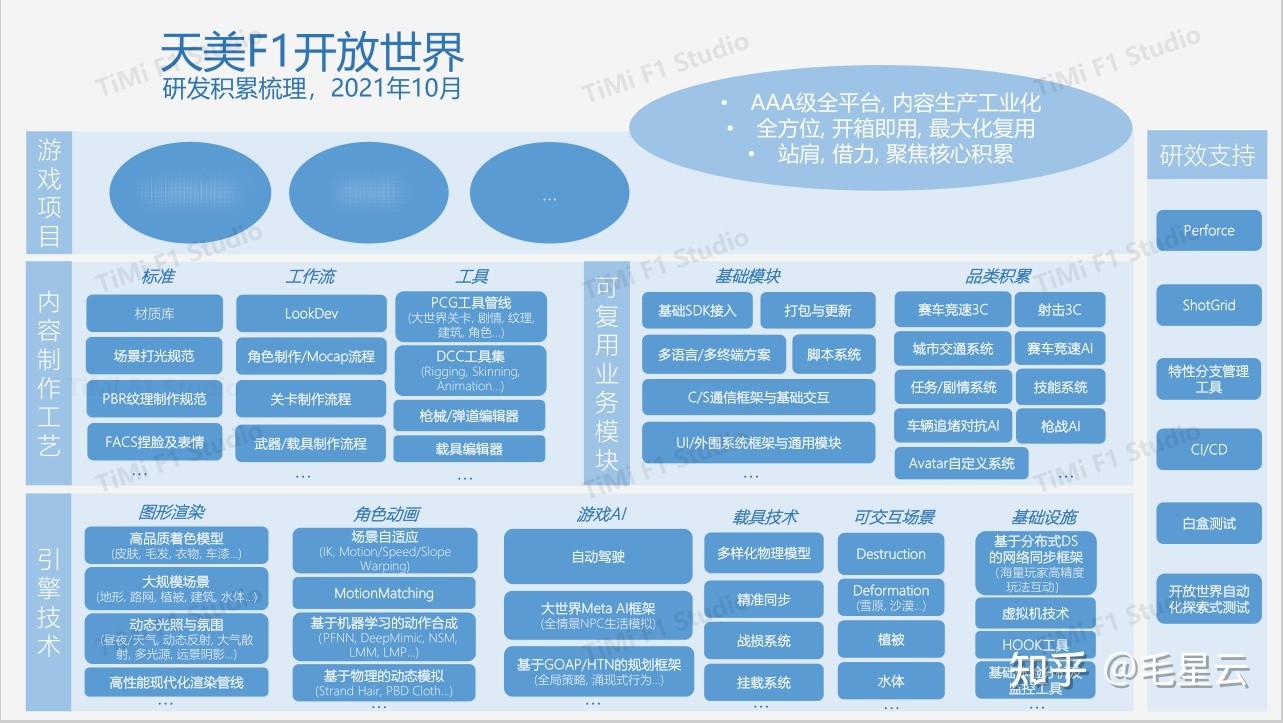 光有“钞能力”是不可能成功的。正如下图中服务于多款AAA项目的内容制作工艺与引擎技术所示,天美F1已经取得了一些较为硬核的研发积累。