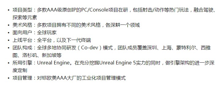 之前天美公布的几个北美在研的主机AAA项目,包括西雅图的射击项目、蒙特利尔的开放世界,其实都是与天美F1协同研发的。在保持当地团队独立自主的同时,可以最大化发挥天美自身的研发积累,以及全球研发的协同作用。