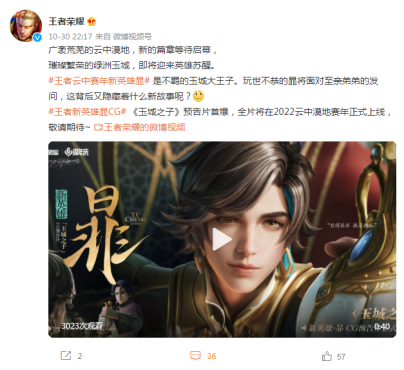 王者新英雄暃CG《玉城之子》预告片首爆,全片将在2022云中漠地赛年正式上线,敬请期待~