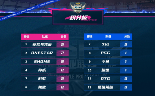 首周结束后积分榜上7支战队以2分并列第一,新秀组战况扑朔迷离,PSG、斗鱼以及耀世积1分,DTG以及顶级荣耀垫底。