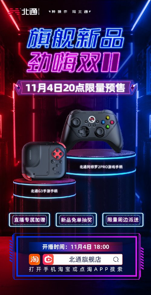 除此之外,北通在开启预售时(11月4日20:00)也会同步于天猫北通旗舰店开启预售直播活动,更多第一手预售优惠信息将在直播中放出,更有直播专属加赠、免单抽奖、限量周边派送等福利活动加码北通双十一,对北通这次的新品预售活动感兴趣的玩家们,可以准时蹲点11月4日晚上20:00天猫北通旗舰店的预售直播活动。