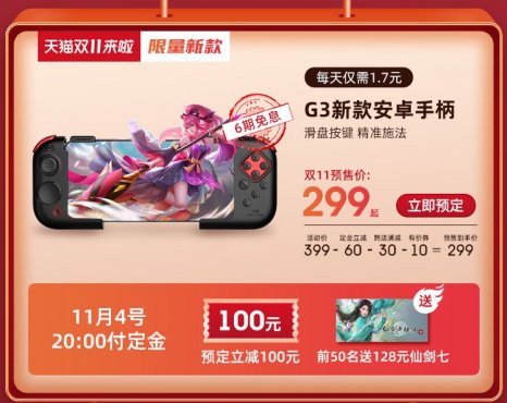 继北通在官方微信公众号正式公布【北通阿修罗2PRO游戏手柄】将开启预售后,11月4日,北通继续在其官方微信平台,官宣了另一款年度旗舰新品【北通G3手游手柄】,该新品也将与【北通阿修罗2PRO游戏手柄】同步开启预售。值得注意的是,在北通的官方预售优惠与天猫双十一折扣活动加持下,【北通G3手游手柄】开启预售后,即可享受百元以上的优惠。