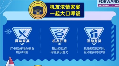 来到一个新的狂欢旅游地,除了看风景拍照留影之外,美食打卡自然也不能落下!福州,也被称为有福之州,自古以来福州物产和海产丰富,故而美食多。机械师家宴带你一起品尝当地闽菜,一场美食饕餮盛宴即将来袭!吃饭当然还得看节目,机友现场展示才艺,除此之外,更有神秘惊喜环节,等你揭晓!来到活动现场,壕礼必须得人手一份,全部都备上!