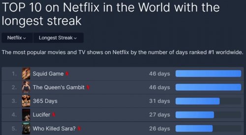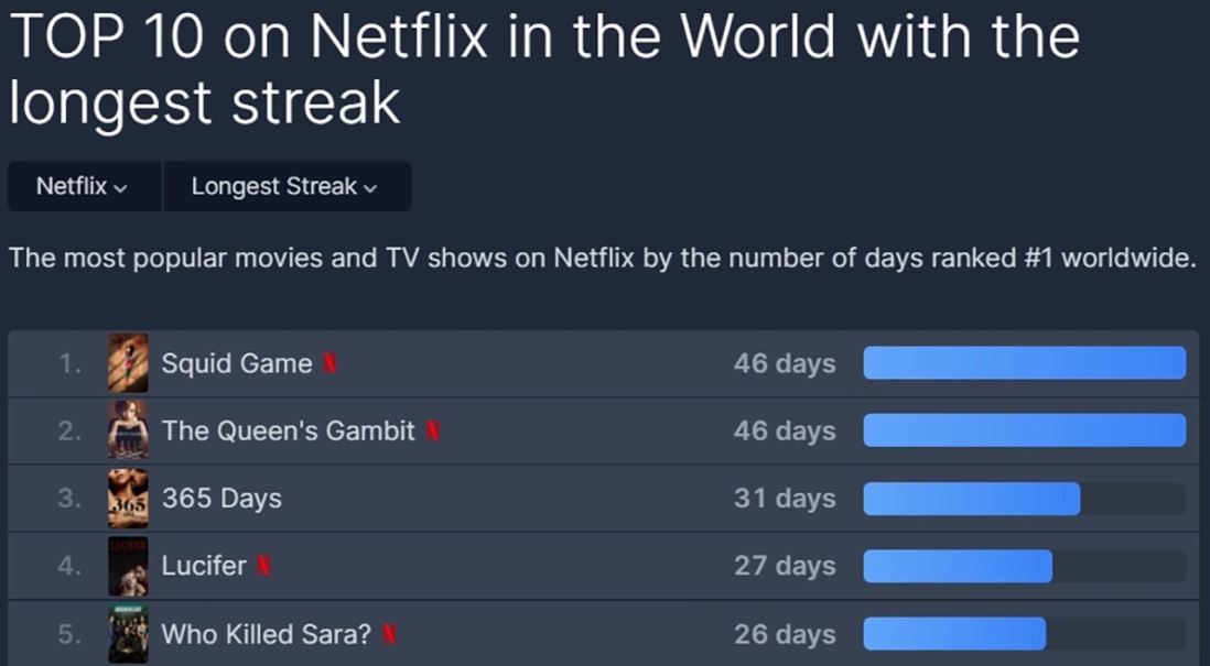 根据FlixPatrol数据显示,《鱿鱼游戏》全球收视率第一的纪录维持了46天,目前排在全球第一纪录保持时间第一,不知道《英雄联盟:双城之战》是否会再次在该榜单上打败《鱿鱼游戏》。