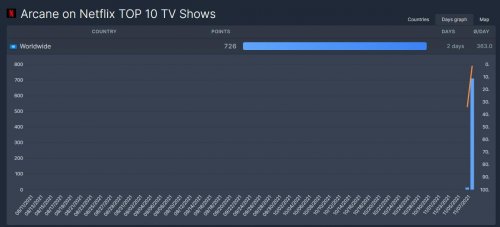 《英雄联盟》的首部动画《英雄联盟:双城之战》已于11月7日上线Netflix和腾讯视频。据统计网站FlixPatrol数据,该动画在11月8日播出前三集内容后,收视率瞬间飙升为Netflix全球收视率榜单第一名。打败了上个榜单第一名韩剧《鱿鱼游戏》,拳头公司这款改编动画已登上38个国家及地区的收视率前十。