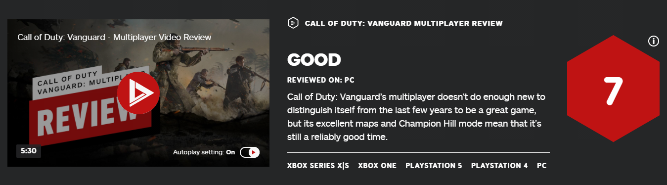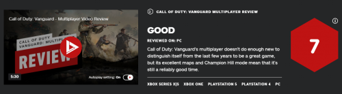 动视旗下射击游戏《使命召唤:先锋》已于11月5日正式发售,此前IGN为该作的单人战役部分打出了7分的评价。现在IGN对本作PC版本的多人模式进行了评测,同样给出了7分评价。评测者认为这次的多人模式刚开始游玩很有趣,射击和动作依然顶级,但是和前代差别并不是很大,它可能不够新鲜,但足够有趣。