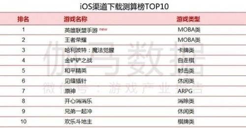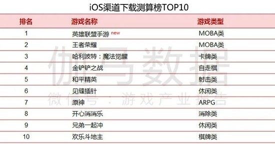 2021年10月iOS下载测算榜TOP10中,《英雄联盟手游》登顶,《英雄联盟手游》上线首月iOS免费榜仅一天为TOP2,其余天数均居榜首。