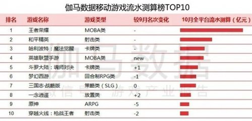 2021年10月,流水测算榜TOP10中,TOP3产品较上月保持不变,依然是《王者荣耀》《和平精英》《哈利波特·魔法觉醒》。