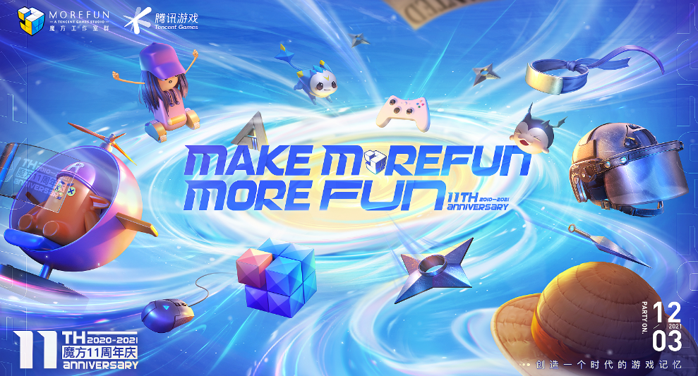 2021年12月3日,魔方工作室群(简称:魔方)迎来十一周年庆,在“创造一个时代的游戏记忆”愿景下,发布“Make Morefun more fun”的品牌主题。魔方期待在全新篇章开启之时,与玩家并肩探索关于乐趣的更多可能,共同定义属于魔方的无限未来:“Make Morefun more ______ ”。魔方的未来,离不开独领风骚的伙伴、格斗的热血、追求极致专业的态度、跨越次元连接你我的真情实感,以及弘扬中国文化,讲述中国故事的担当,更离不开倾听玩家想法,融入产品创新的真诚。