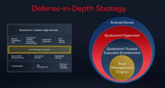 骁龙8就在面向合作伙伴、客户开源的Hypervisor之下,又增加了一层信任管理引擎(Trust Management Engine),使得敏感数据和应用有了更牢靠的隔离层,必要时还能协同云端展开安全服务。信任管理引擎符合Android Ready SE联盟要求,手机将具备更多安全特性。