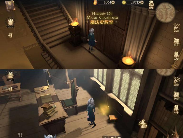 14、来到城堡主楼→进入魔法史教室→窗户前的书堆旁可看到金色发光物,点击即可获得拼图