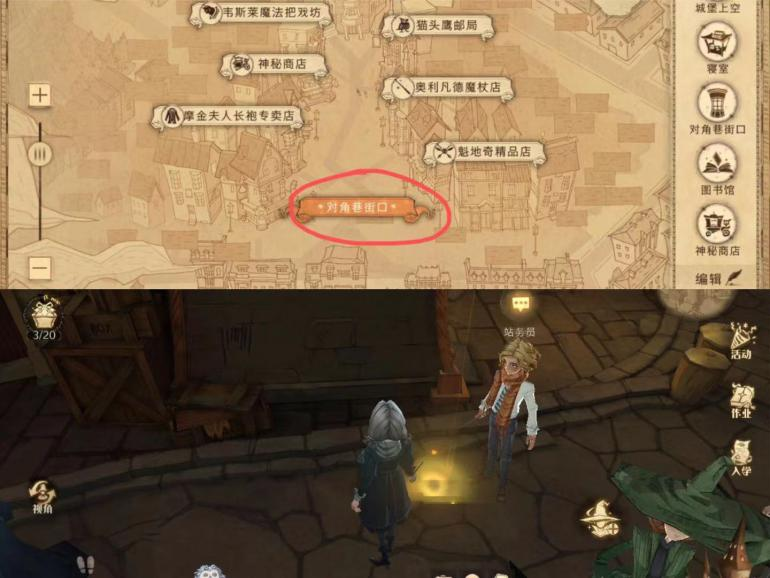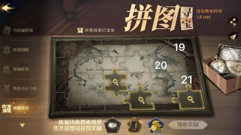 21、来到对角巷→在地图上点击对角巷街口→进入地图时的方位,右手边第一个房子的墙边旁有金色发光物,点击即可获得拼图