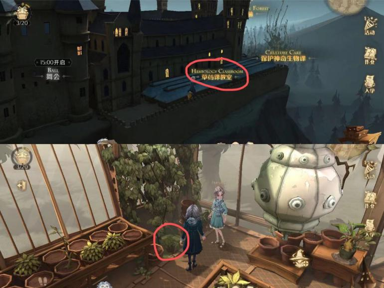 20、来到城堡上空→找到草药课教室并进入→在窗户前书堆旁找到会动的盆栽,点击即可获得拼图