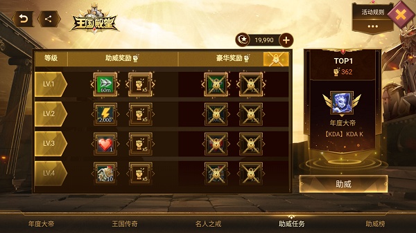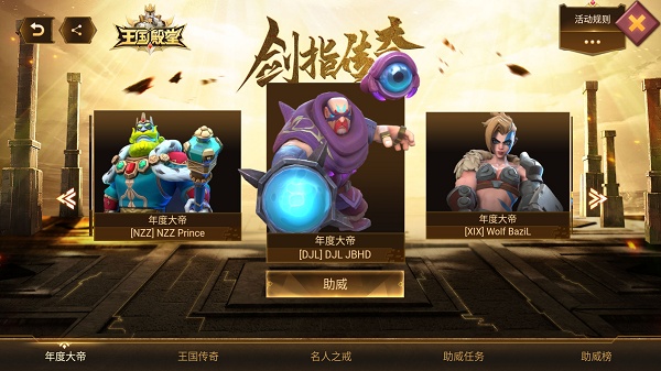 在聆听全新游戏主题曲的同时,大家也别忘了来参观由艾娜希建筑家协会搭建的“王国殿堂”,经过半年的日夜赶工,目前终于正式竣工!从12月16日起至12月31日,各位领主可以前往“王国殿堂”内,为你所认可的那个传奇玩家进行助威并累积殿堂积分,即可解锁包括“火炽鬃羽”、“神火余烬”、“决战宝箱”在内的人气道具奖励与助威令。传奇领主们还将获得由矮人族工匠精心打造的王国殿堂专属戒指!