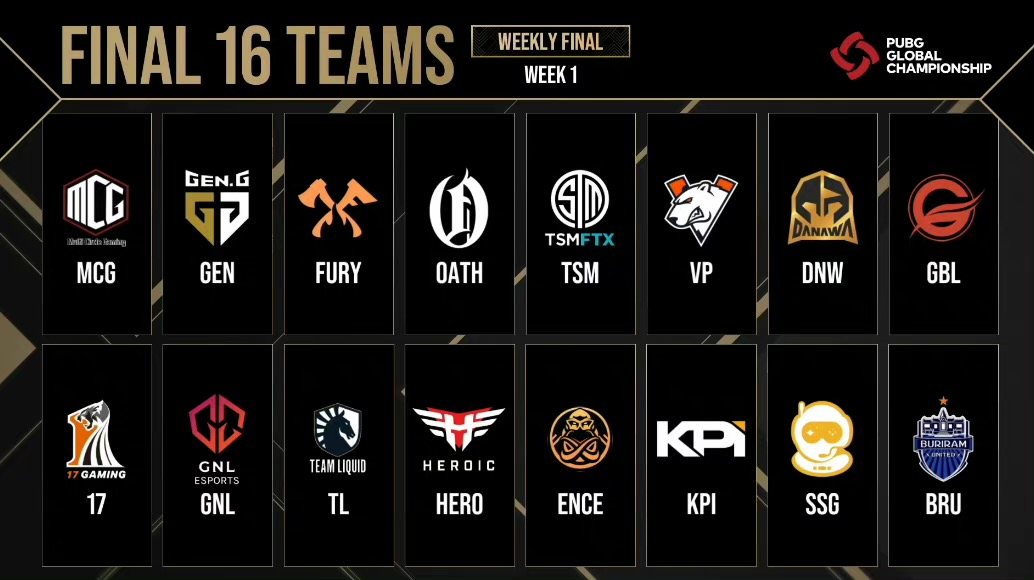 经过三天排位赛的对决,激动人心的周系列赛在本周正式开启,首先进行的是16场精彩纷呈的周中赛。由于周中赛采用吃鸡赛制,各队开始都比较求稳,前期少有摩擦。首局比赛决赛圈刷在麦田,MCG战队三人先淘汰掉GEN.G战队和OATH战队独狼,最后面对TL战队三人,逐个击破,拿下周中赛开门红!随后, GEN.G、OATH、VP、GBL、TL、ENCE等传统强队纷纷突围成功。第九局比赛,17战队在前期一人掉线,中后期不断被刷出圈外的情况下,依靠准确的运营策略和精湛的枪法不断向北推进,最后面对满编的NAVI战队打出完美协同,成功吃鸡。而同样来自PCL赛区的NH、PeRo、KX战队则稍显可惜,未能晋级到周决赛中。