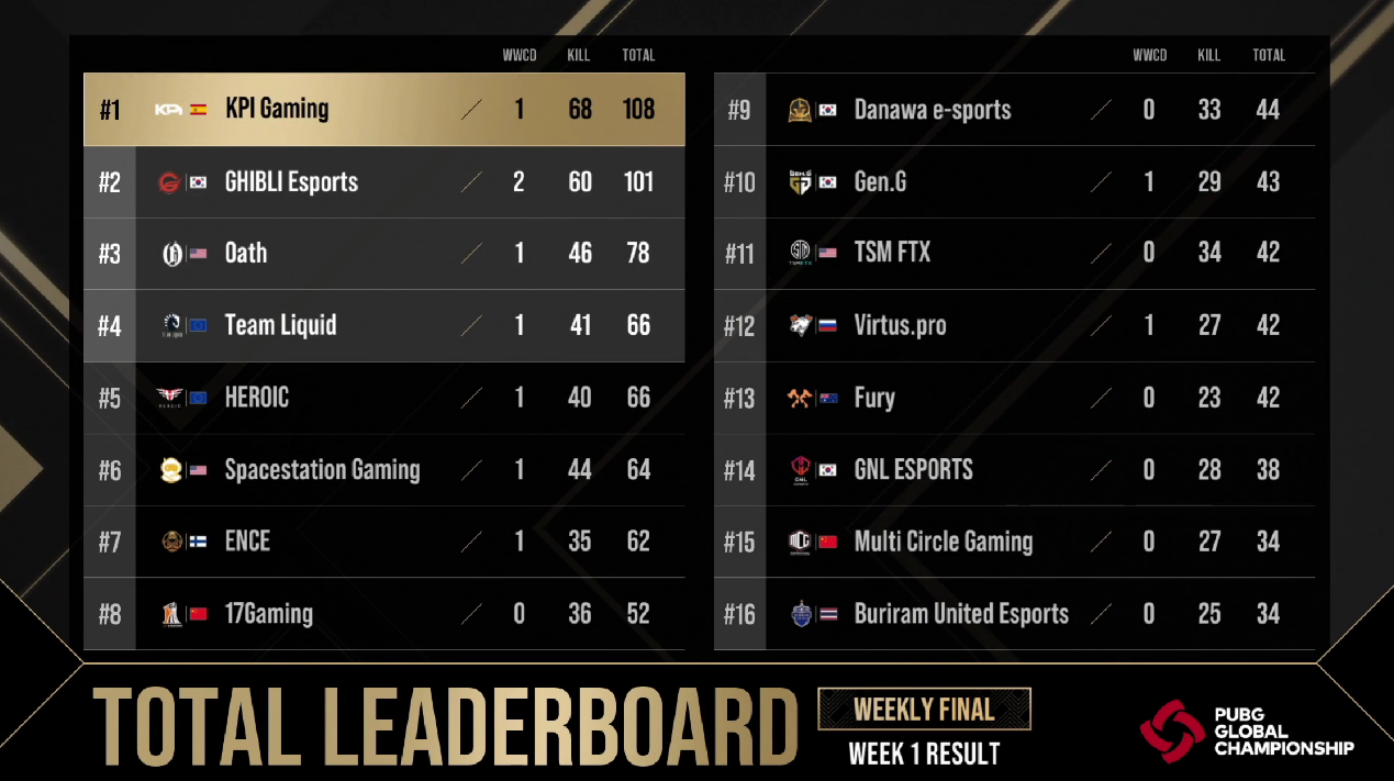 进入到周决赛中,KPI战队犹如脱胎换骨一般,手感爆棚,每局都能跻身前八,并拿下不少的淘汰数。首日,KPI战队虽然未能吃鸡,但超高的淘汰分使得他们暂列积分榜首位。次日比赛,KPI战队越战越勇,场均淘汰更是超过7个。次日第三场比赛,KPI战队拿到圈中高点位置,而队内的Dr4FTk1NG选手则是在低点埋伏,成功夹击掉TL战队,最后锁住SSG战队两人位置,三打二成功吃鸡。凭借几乎完美的发挥,KPI战队收获全场最高的68个淘汰,并以108分的超高积分摘得本周的周冠军,并拿到总决赛直通名额以及3万美元的奖金。