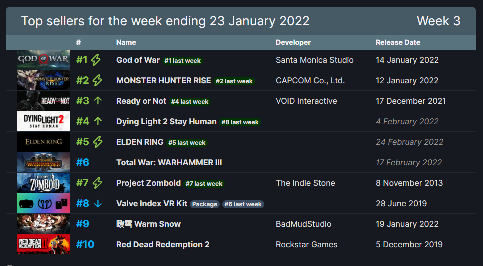 V社公布了上周(2022年1月17日至1月23日)的Steam销量排行。本次第一和第二名没有变化,索尼的第一方大作《战神4》再次夺得了销量榜冠军。而卡普空的狩猎游戏《怪物猎人:崛起》依旧是第二名。第三名是《严阵以待》,值得注意的是,国风动作rogue《暖雪》获得了本次榜单的第九名。