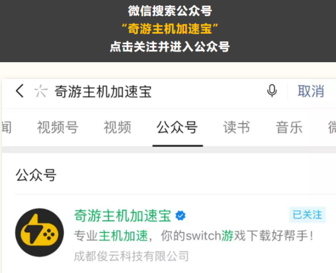 1、关注微信公众号【奇游主机加速宝】;