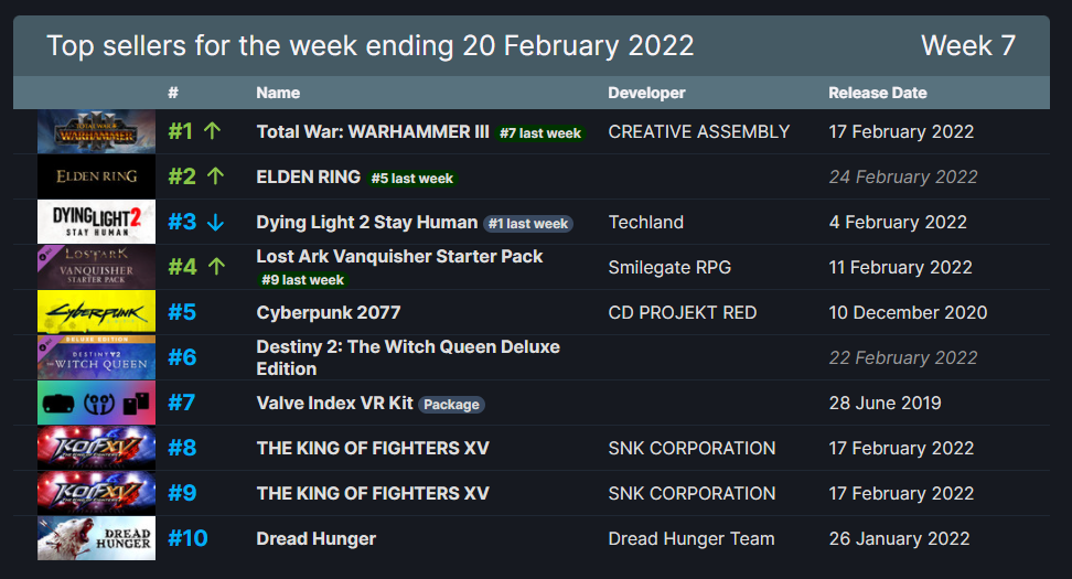 V社公布了上周(2022年2月14日至2月20日)Steam的销量排行。获得销量冠军的是CREATIVE ASSEMBLY开发制作的《全面战争:战锤3》。第二名是FS社新作《艾尔登法环》的预购。第三名是《消逝的光芒2:人与仁之战》。《拳皇15》的两种版本也登上了周销榜前十。