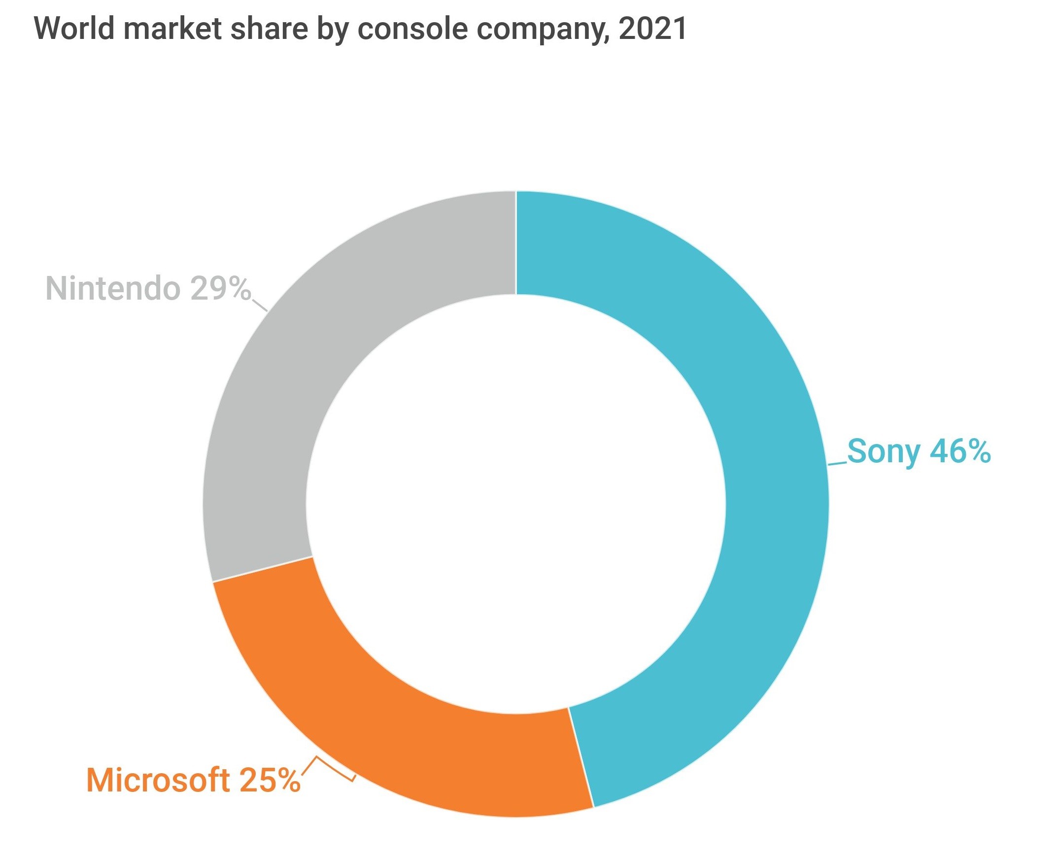 索尼的市场份额与2020年相比有所提高,占46%;任天堂的的市场份额比上一年度下滑2%变成29%,而微软增长了1%达到25%。