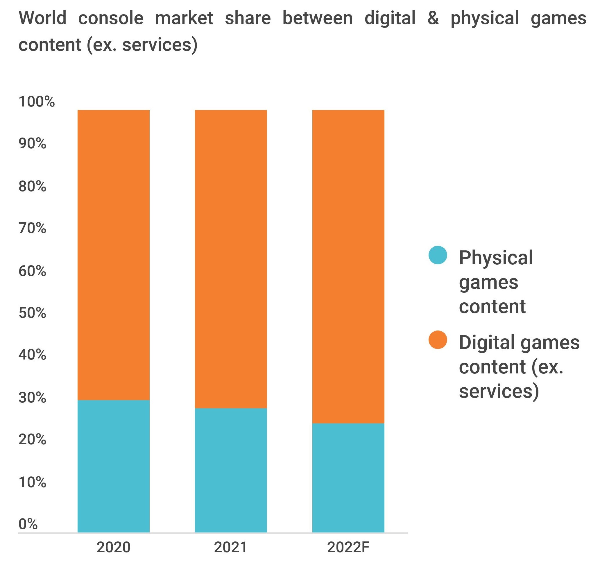 人们越来越偏爱数字版游戏,盒装游戏的市场份额首次跌破30%。虽然有Switch卡带拉动消费,但报告预测,这个数字可能会在今年继续下降,纯数字版主机Xbox Series S的大卖也推动了这个趋势。