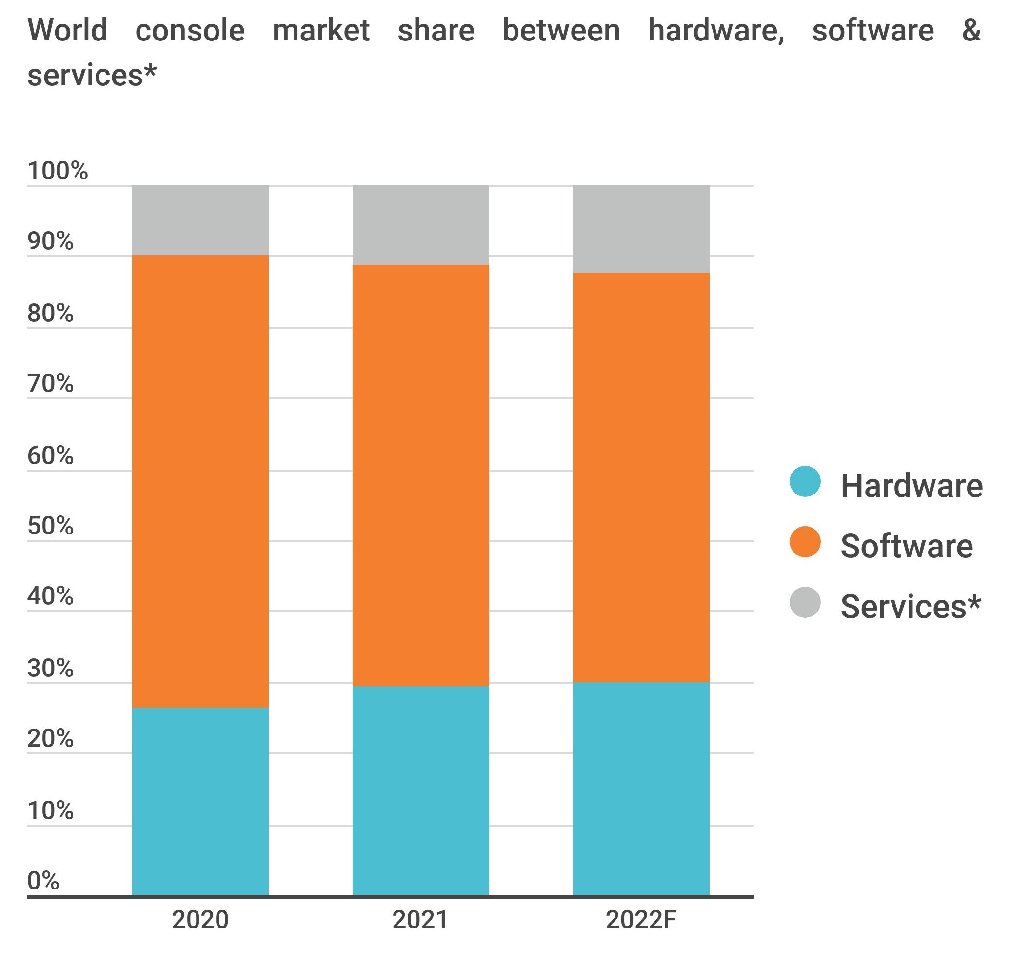 三年主机游戏市场硬件、软件、服务消费份额对比