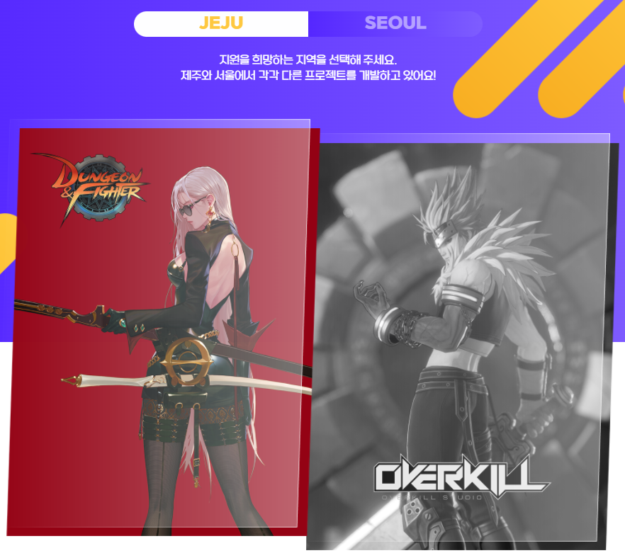 在其公司的招聘页面上,Neople的济州岛工作室和首尔工作室分别负责了两个项目。其中济州岛工作室负责开发《地下城与勇士》以及衍生3D横版ARPG《OVERKILL》;首尔工作室负责开发《地下城与勇士手游》以及魂Like新作《Project AK》。