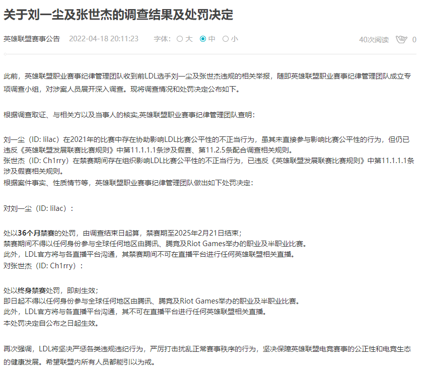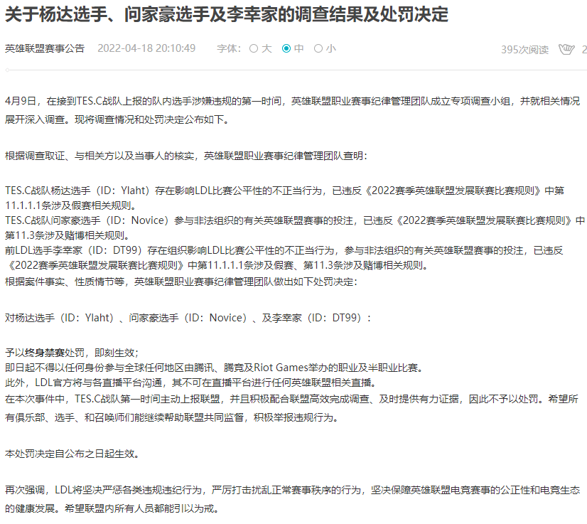 此外,LDL官方将与各直播平台沟通,其禁赛期间不可在直播平台进行任何英雄联盟相关直播。