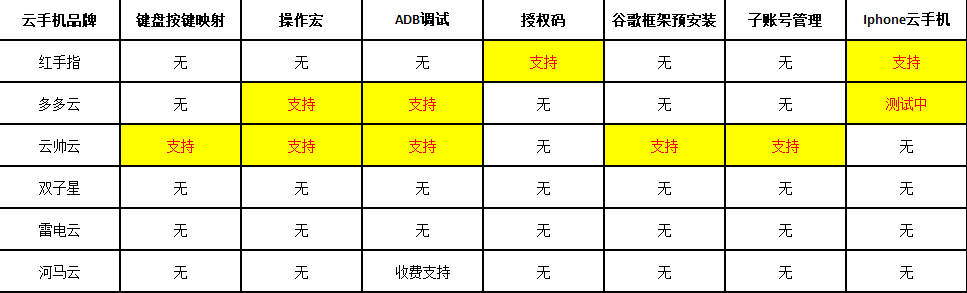 下面是功能的对比排行榜,对于很多薅羊毛搬砖的玩家来说功能是非常重要的,能不能同步多开呀,能不能不同设备的帐号互通呀,能不能一件新建呀,这些都是评判的标准: