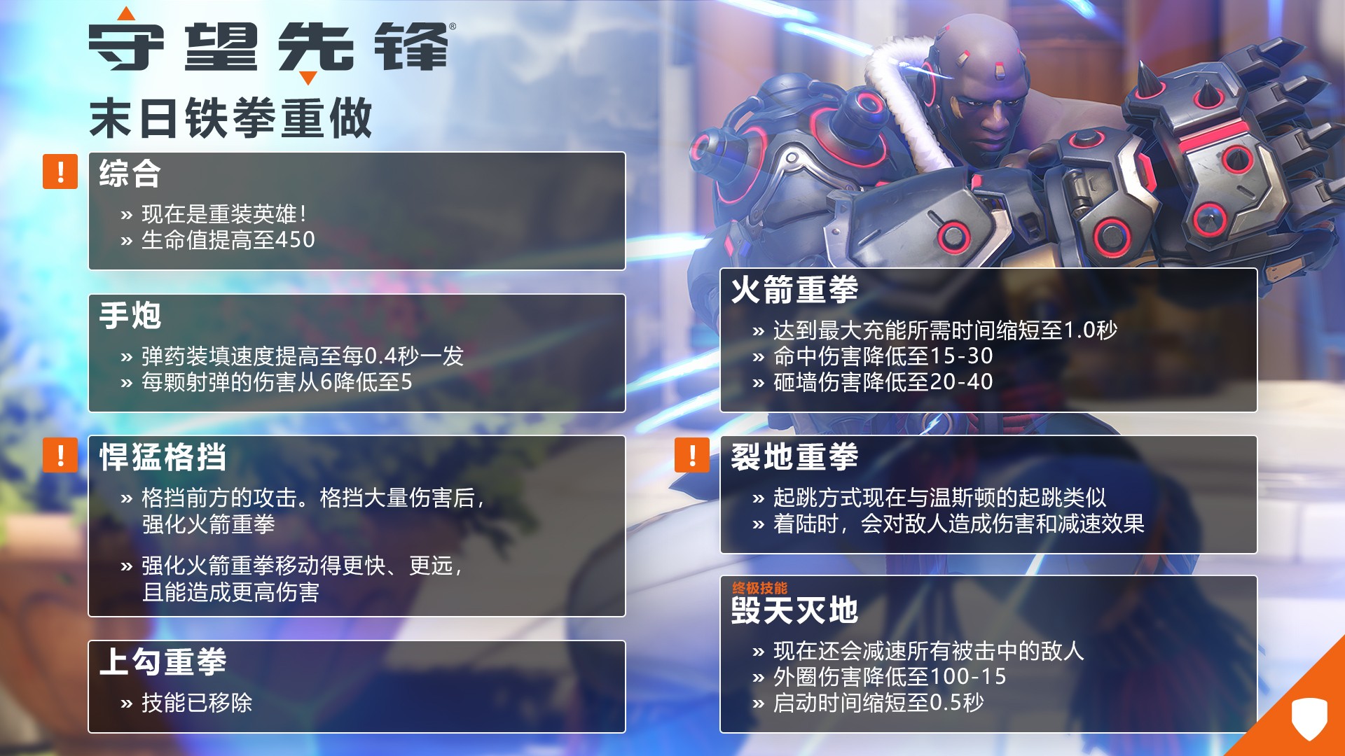 “末日铁拳”的终极技能“毁天灭地”获得了全新的功能,并且缩短了施放时间。总体而言,这个技能造成的伤害输出有所降低,但中心区域的落地直击依然势大力沉。我们移除了击退效果,改为使被命中的所有敌人减速,将其调整为了出色的开团工具。改版后的终极技能与重装改动相得益彰,使他依然像输出英雄一样,能够流畅灵活地打出一锤定音的效果。虽然全新的定位和连招组合还需要多加熟悉才能掌握,但“末日铁拳”已经转变成了一名更易上手、打法自由、影响力十足的重装英雄,而手感体验依然是那个玩家们所熟悉的“末日铁拳”。