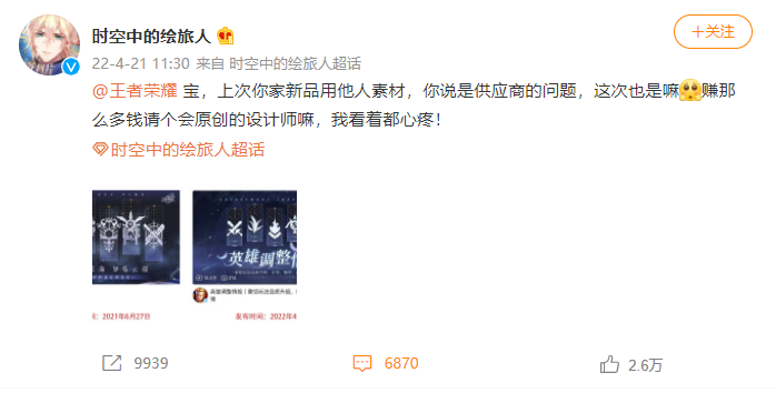去年《王者荣耀》IP新游海报抄袭《原神》,最后官方出面道歉。今天《王者荣耀》又被指抄袭,网易旗下手游《时空中的绘旅人》官方发文称,《王者荣耀》发布的更新公告封面涉嫌抄袭。