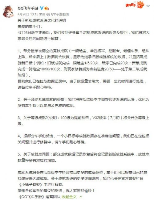 对此《QQ飞车手游》官方发布公告表示,将会恢复被清空的成就数据,但需要一定时间处理。不过对玩家提到的其他改动等问题尚未提及。