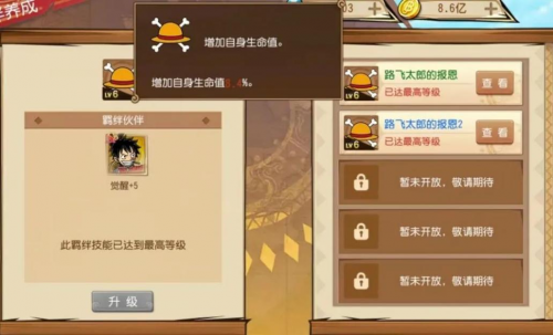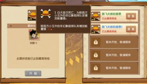 蓝色羁绊的羁绊队友同样也是【路飞太郎】,升级的成本略微降低了,在培养路飞太郎的同时能升级小玉的两个羁绊等级。