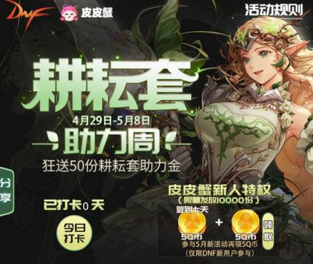 皮皮蟹为DNF新人玩家准备万份QB礼包,参与活动的DNF新玩家,签到7天即可领取10QB,奖励限量发放,新玩家们赶紧行动起来。