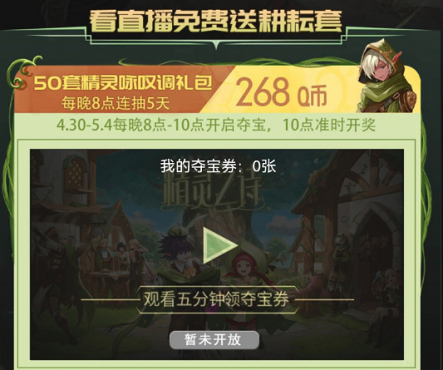 4月30日至5月4日,连续5日每晚8点至10点开启观看直播夺宝活动。在该时间段,参与活动,在活动直播间观看直播,将有机会瓜分50套精灵咏叹调礼包。每晚10点准时开奖,喜欢看直播的玩家用户千万不要错过直播时间,边看直播还有机会赢大礼,一举两得,快来试一试。