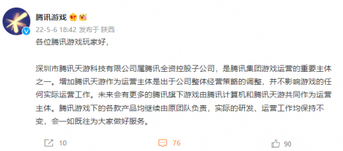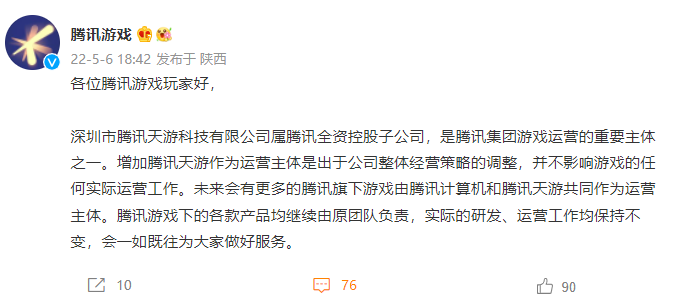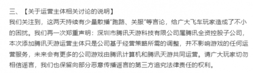 深圳市腾讯天游科技有限公司属腾讯全资控股子公司,是腾讯集团游戏运营的重要主体之一。增加腾讯天游作为运营主体是出于公司整体经营策略的调整,并不影响游戏的任何实际运营工作。未来会有更多的腾讯旗下游戏由腾讯计算机和腾讯天游共同作为运营主体。腾讯游戏下的各款产品均继续由原团队负责,实际的研发、运营工作均保持不变,会一如既往为大家做好服务。