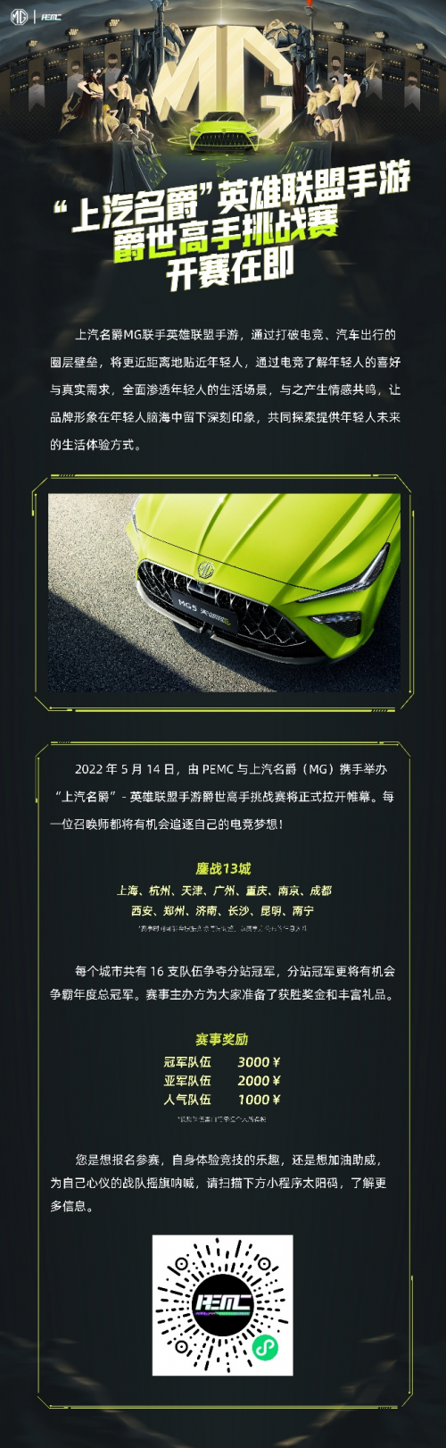 英雄集结,敢玩敢秀!近日,上汽名爵正式宣布与PEMC达成官方合作,携手举办英雄联盟手游爵世高手挑战赛。本届挑战赛设置分站赛和总决赛两个赛程,共覆盖南宁、南京、杭州、西安、天津、成都、上海、济南、广州、郑州、长沙、重庆、昆明等13个城市分站。每个分站比赛将通过16支队伍,以16进8、8进1的形式,决选出13名分站冠军,最终将有机会争霸年度总冠军。