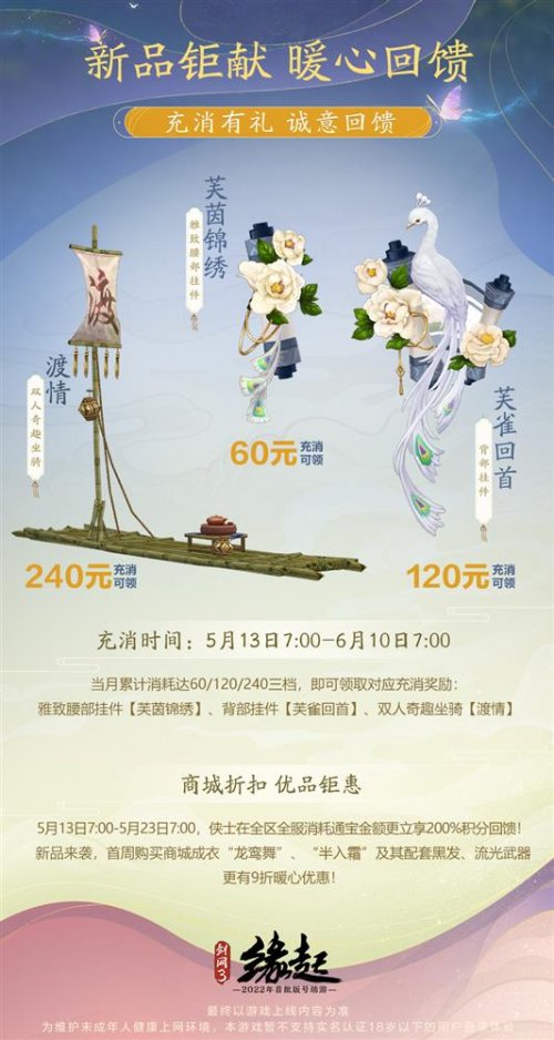 温情回馈,充消有礼。5月13日7:00-6月10日7:00,累计充值并消耗60元/120元/240元,可分别领取雅致腰挂【芙茵锦绣】、背挂【芙雀回首】、双人奇趣坐骑【渡情】!5月13日7:00-5月23日7:00,侠士在全区全服消耗通宝金额更享有200%积分回馈!