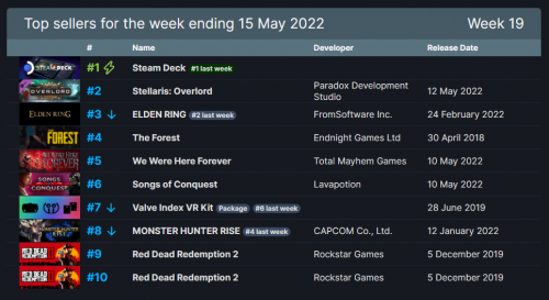V社公布了上周(2022年5月9日至5月15日)Steam的销量排行。获得第一名的是V社推出的的Steam Deck掌机,这是这个掌机第五次夺冠。第二名由策略游戏《群星》的全新扩展包“四海皆臣”获得,第三名是《艾尔登法环》。