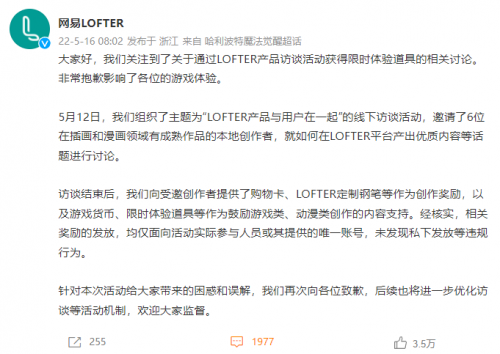 访谈结束后,我们向受邀创作者提供了购物卡、LOFTER定制钢笔等作为创作奖励,以及游戏货币、限时体验道具等作为鼓励游戏类、动漫类创作的内容支持。经核实,相关奖励的发放,均仅面向活动实际参与人员或其提供的唯一账号,未发现私下发放等违规行为。