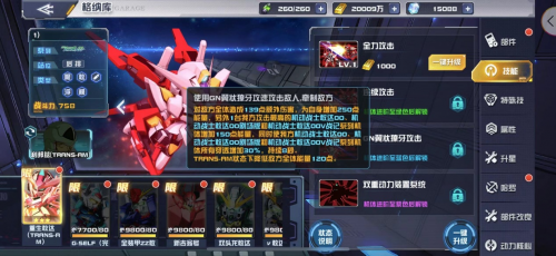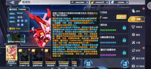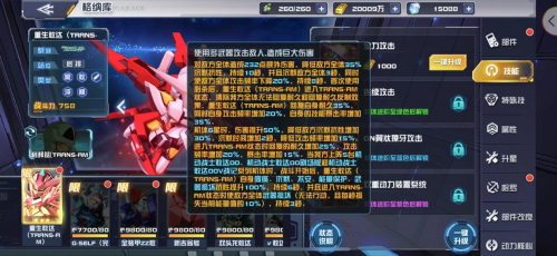 重生敢达的GN翼状獠牙攻击会对敌方全体造成139点额外伤害,为自身增加250点能量,另外1台我方攻击最高的机动战士敢达00、机动战士敢达00剧场版和机动战士敢达这00V战记系列机体增加150点能量,同时使我这三种机体所有穿透增加30%,持续8秒。TRANS-AM状态下降低敌方全体能量120点。