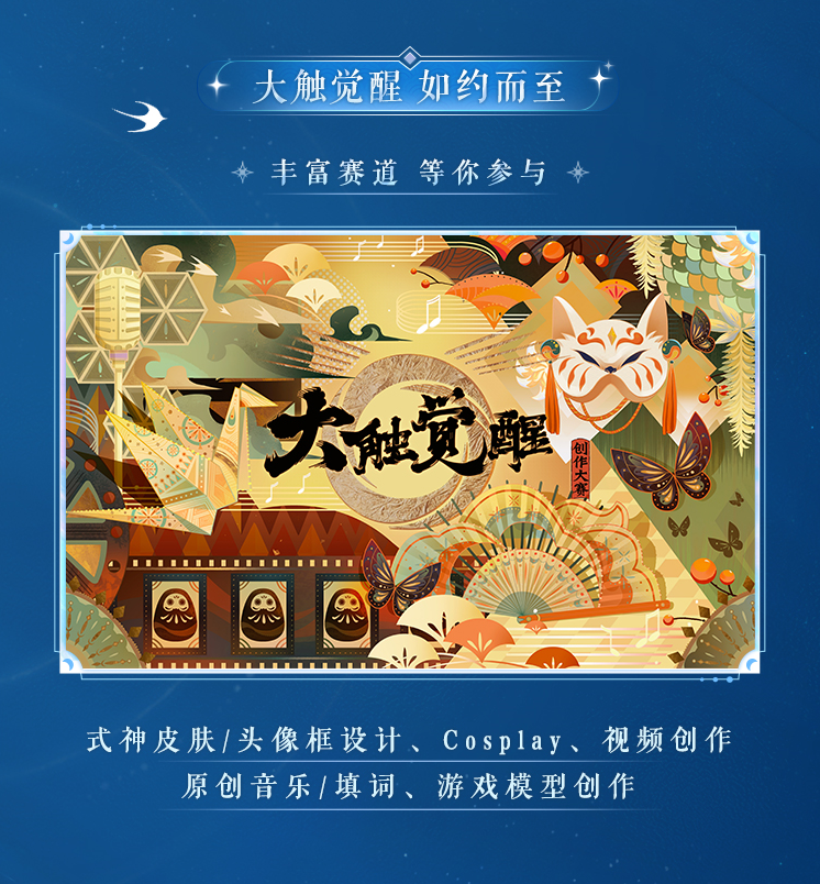 《阴阳师》年度品牌赛事《大触觉醒》即将开启,将开放包括式神皮肤/头像框设计、cosplay、视频创作、原创音乐/填词、游戏模型创作等多个赛道的比赛,夯实玩家创作生态。