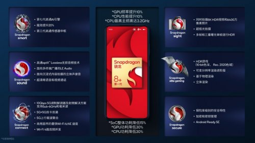 此外骁龙8拥有的特性与规格,骁龙8+平台一个不落。包括骁龙X65 5G 调制解调器、高通 FastConnect 6900 移动连接系统、骁龙畅听技术(Snapdragon Sound)、Snapdragon Elite Gaming 等等。