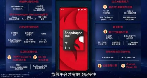 其他特性方面,骁龙7支持部分 Snapdragon Elite Gaming 特性,比如 Adreno 图像运动引擎,该特性可在近乎同等功耗下使帧率翻倍,带来更佳游戏体验。同时 GPU 性能进一步增强,其图形渲染速度提升超过 20%。该平台还支持沉浸式 QHD+ 显示、可变分辨率渲染以及面向多人游戏的防啸叫等功能。落到用户最常用的影像功能上,骁龙7也不甘落后。它采用了 14-bit Qualcomm Spectra 三 ISP 平台,即可同时使用三个摄像头进行拍摄,或者拍摄单张分辨率达 2 亿像素的照片,以往只出现在 Android 旗舰手机上的特性,如今下放至高通中端移动平台上,让更多用户可以接触到好用的技术。骁龙7与第七代高通 AI 引擎结合,摄像头变得更智能,体现在自动对焦、人像虚化等实际应用层面。骁龙7包含专用信任管理引擎,并且符合 Android Ready SE 标准,该特性也是首次在这一级别芯片中实现。